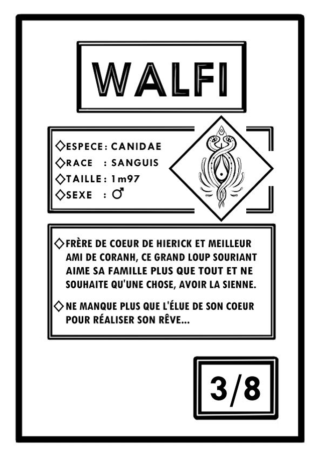 Carte de personnage de mon univers. Consistant à avoir 2 plans qui décrivent des facettes différentes du personnage. Son verso donne davantage d'informations de lui et de ses relations avec les autres.